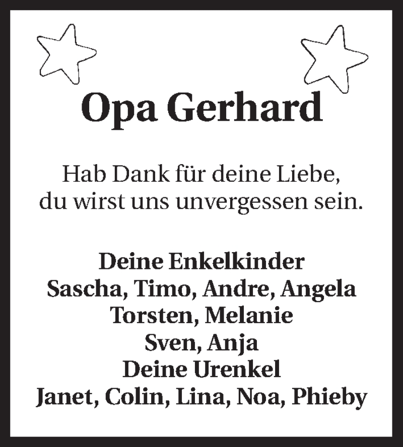 Hier finden Sie alle Traueranzeigen aus der Zeitung, die bisher für Gerhard Stanschus erschienen sind. Weitere Traueranzeigen, die in der Zeitung erscheinen, werden hier ebenfalls aufgelistet