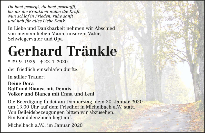 Hier finden Sie alle Traueranzeigen aus der Zeitung, die bisher für Gerhard Tränkle erschienen sind. Weitere Traueranzeigen, die in der Zeitung erscheinen, werden hier ebenfalls aufgelistet