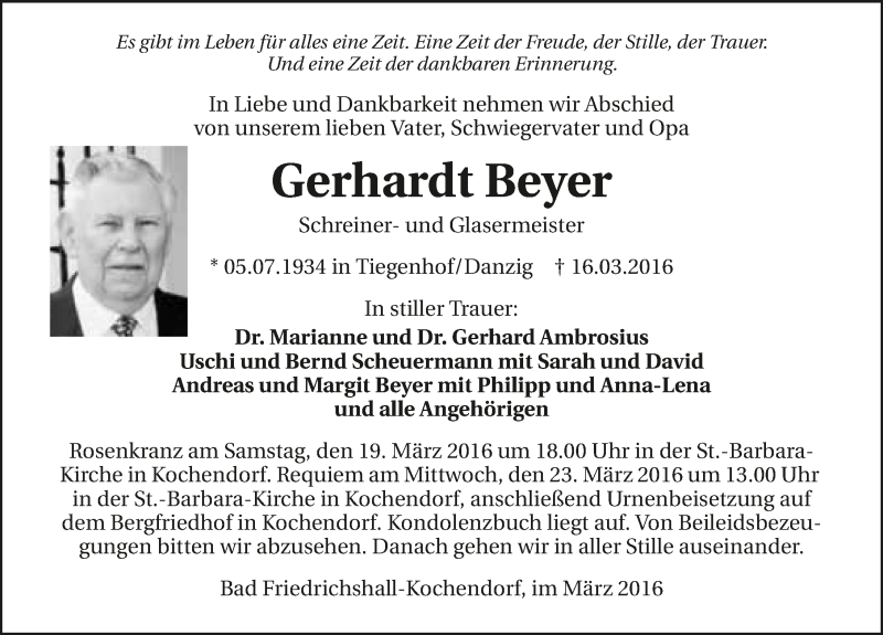 Hier finden Sie alle Traueranzeigen aus der Zeitung, die bisher für Gerhardt Beyer erschienen sind. Weitere Traueranzeigen, die in der Zeitung erscheinen, werden hier ebenfalls aufgelistet