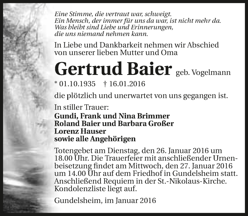 Hier finden Sie alle Traueranzeigen aus der Zeitung, die bisher für Gertrud Baier erschienen sind. Weitere Traueranzeigen, die in der Zeitung erscheinen, werden hier ebenfalls aufgelistet
