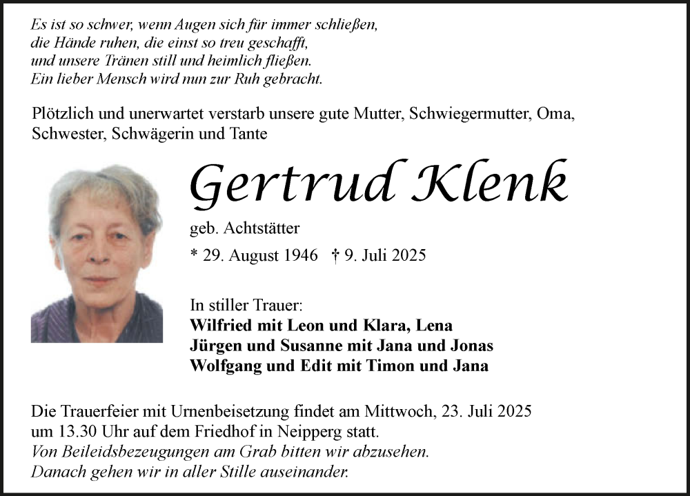 Hier finden Sie alle Traueranzeigen aus der Zeitung, die bisher für Gertrud Klenk erschienen sind. Weitere Traueranzeigen, die in der Zeitung erscheinen, werden hier ebenfalls aufgelistet