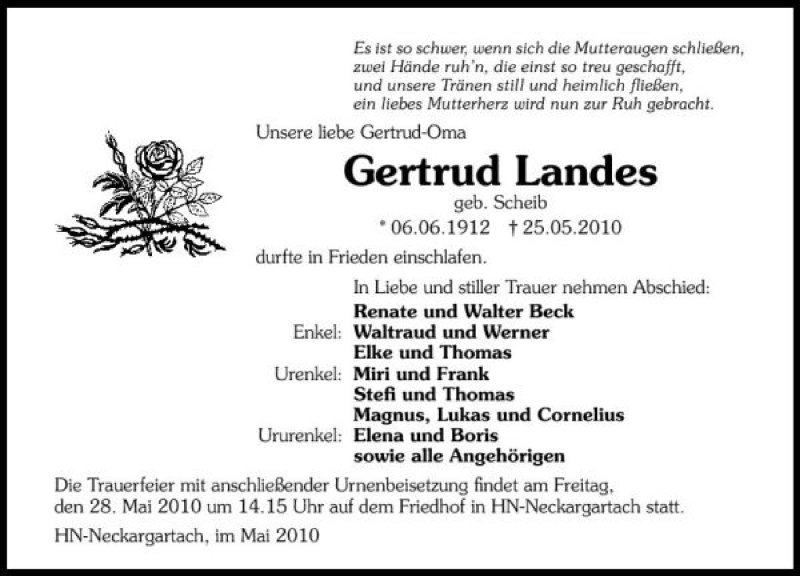 Hier finden Sie alle Traueranzeigen aus der Zeitung, die bisher für Gertrud Landes erschienen sind. Weitere Traueranzeigen, die in der Zeitung erscheinen, werden hier ebenfalls aufgelistet