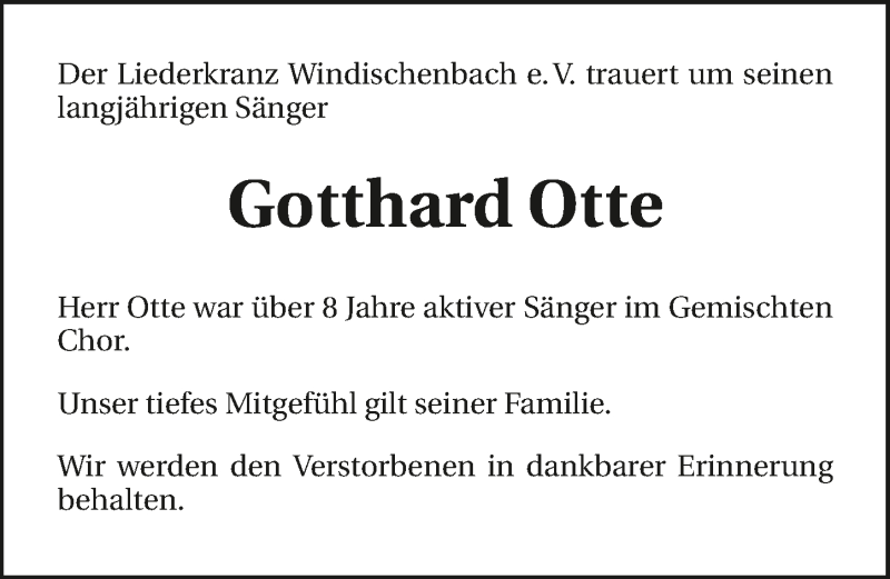 Hier finden Sie alle Traueranzeigen aus der Zeitung, die bisher für Gotthard Otte erschienen sind. Weitere Traueranzeigen, die in der Zeitung erscheinen, werden hier ebenfalls aufgelistet