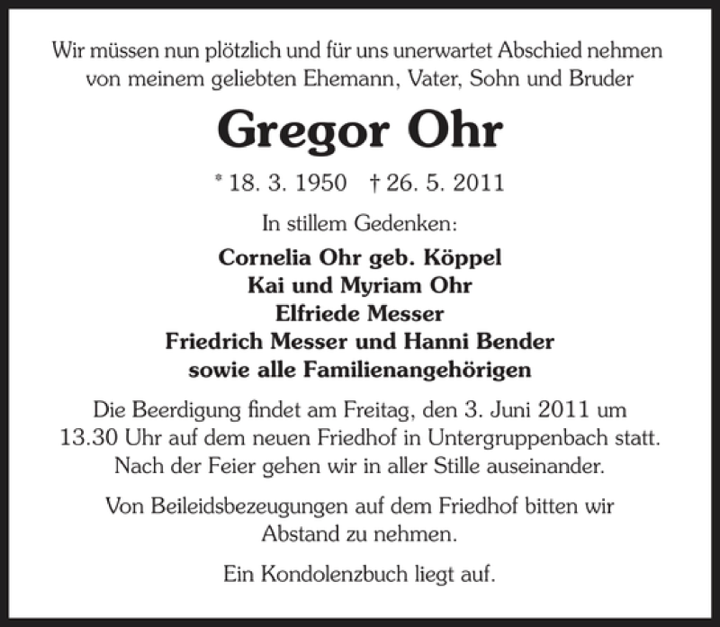 Hier finden Sie alle Traueranzeigen aus der Zeitung, die bisher für Gregor Ohr erschienen sind. Weitere Traueranzeigen, die in der Zeitung erscheinen, werden hier ebenfalls aufgelistet