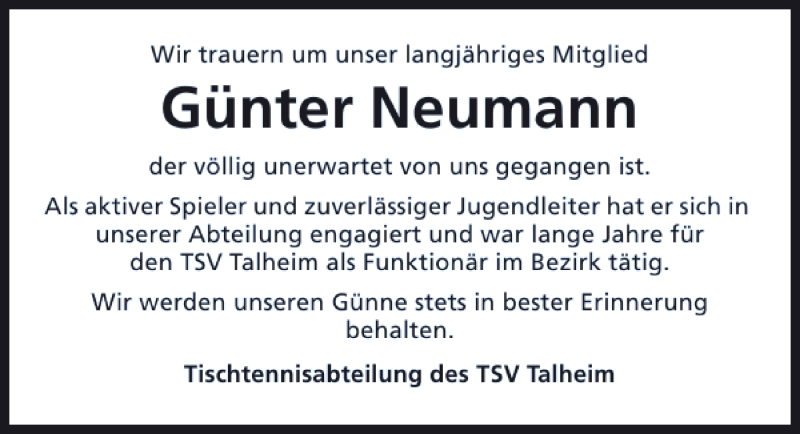 Hier finden Sie alle Traueranzeigen aus der Zeitung, die bisher für Günter Neumann erschienen sind. Weitere Traueranzeigen, die in der Zeitung erscheinen, werden hier ebenfalls aufgelistet