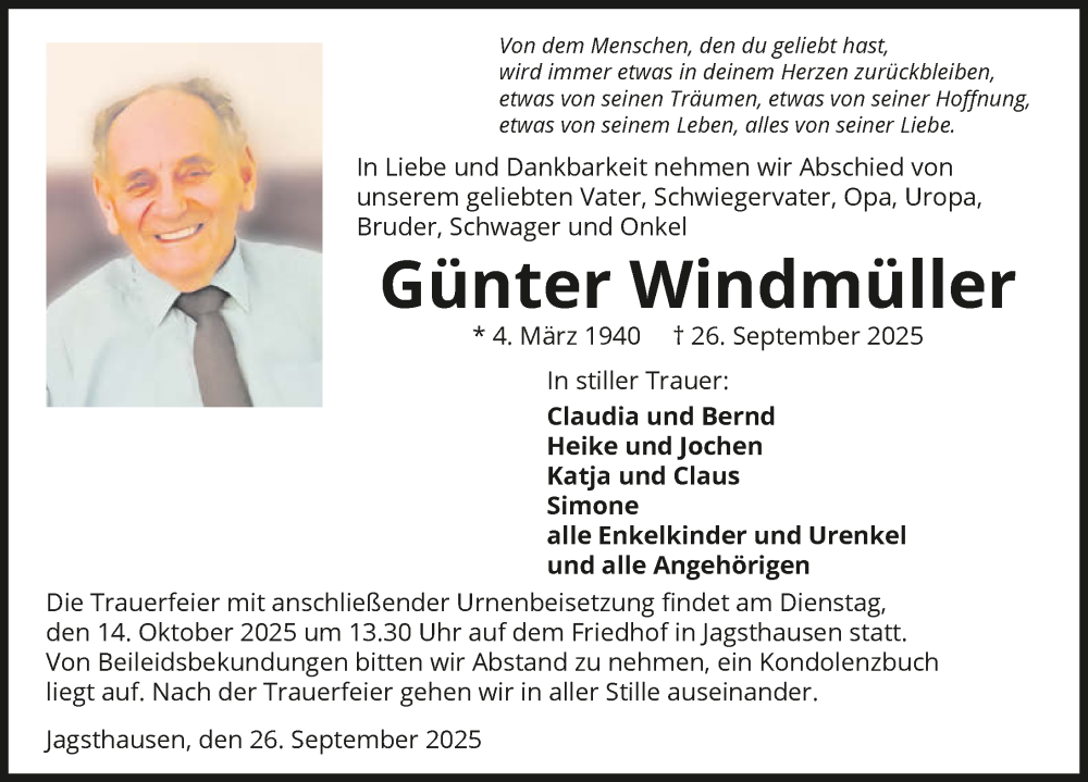 Hier finden Sie alle Traueranzeigen aus der Zeitung, die bisher für Günter Windmüller erschienen sind. Weitere Traueranzeigen, die in der Zeitung erscheinen, werden hier ebenfalls aufgelistet