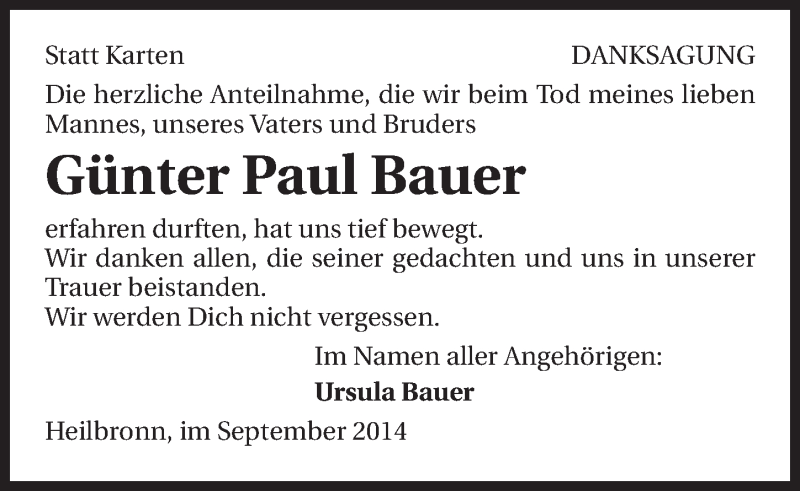 Hier finden Sie alle Traueranzeigen aus der Zeitung, die bisher für Günter Paul Bauer erschienen sind. Weitere Traueranzeigen, die in der Zeitung erscheinen, werden hier ebenfalls aufgelistet