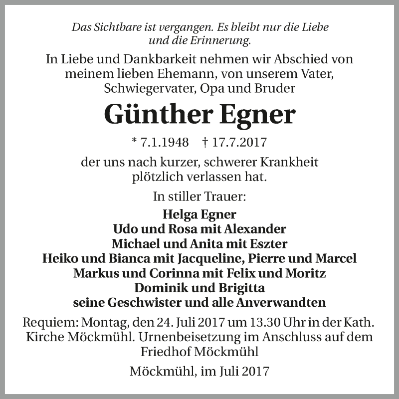 Hier finden Sie alle Traueranzeigen aus der Zeitung, die bisher für Günther Egner erschienen sind. Weitere Traueranzeigen, die in der Zeitung erscheinen, werden hier ebenfalls aufgelistet