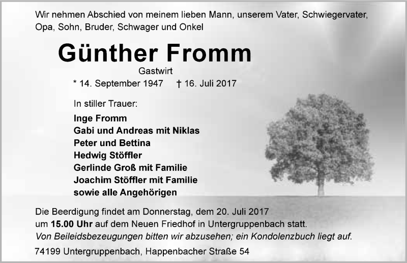 Hier finden Sie alle Traueranzeigen aus der Zeitung, die bisher für Günther Fromm erschienen sind. Weitere Traueranzeigen, die in der Zeitung erscheinen, werden hier ebenfalls aufgelistet