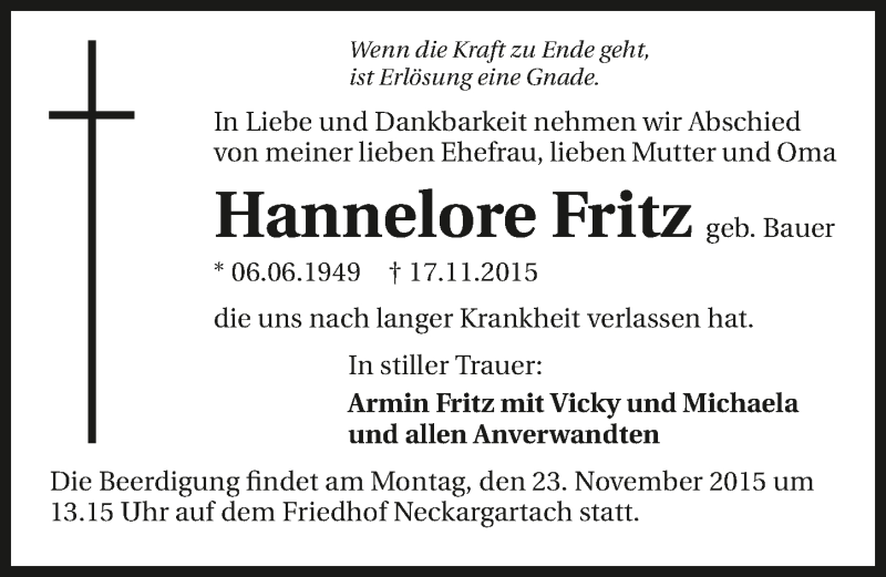 Hier finden Sie alle Traueranzeigen aus der Zeitung, die bisher für Hannelore Fritz erschienen sind. Weitere Traueranzeigen, die in der Zeitung erscheinen, werden hier ebenfalls aufgelistet