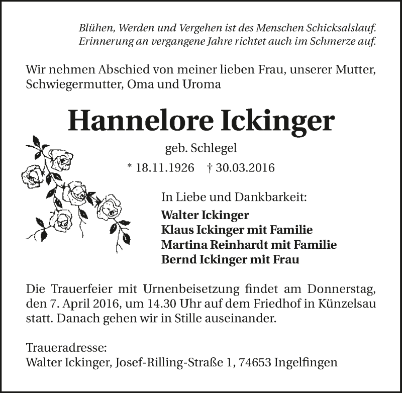 Hier finden Sie alle Traueranzeigen aus der Zeitung, die bisher für Hannelore Ickinger erschienen sind. Weitere Traueranzeigen, die in der Zeitung erscheinen, werden hier ebenfalls aufgelistet