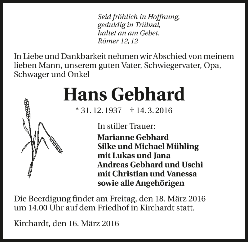 Hier finden Sie alle Traueranzeigen aus der Zeitung, die bisher für Hans Gebhard erschienen sind. Weitere Traueranzeigen, die in der Zeitung erscheinen, werden hier ebenfalls aufgelistet