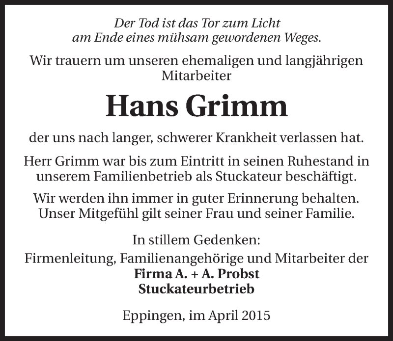 Hier finden Sie alle Traueranzeigen aus der Zeitung, die bisher für Hans Grimm erschienen sind. Weitere Traueranzeigen, die in der Zeitung erscheinen, werden hier ebenfalls aufgelistet