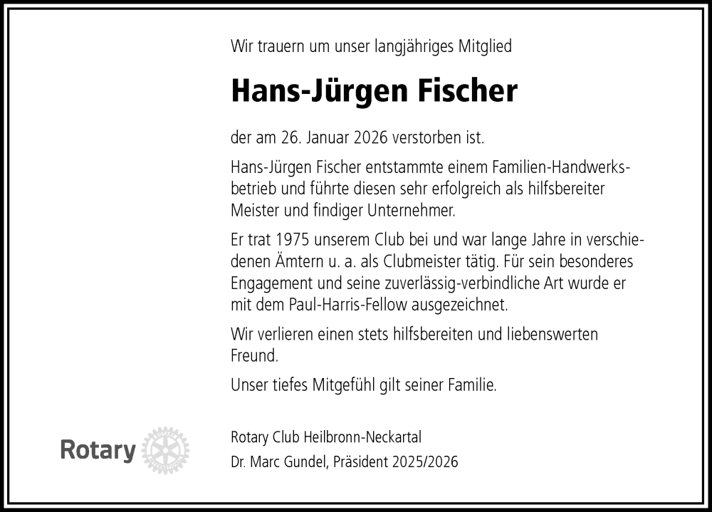 Hier finden Sie alle Traueranzeigen aus der Zeitung, die bisher für Hans-Jürgen Fischer erschienen sind. Weitere Traueranzeigen, die in der Zeitung erscheinen, werden hier ebenfalls aufgelistet
