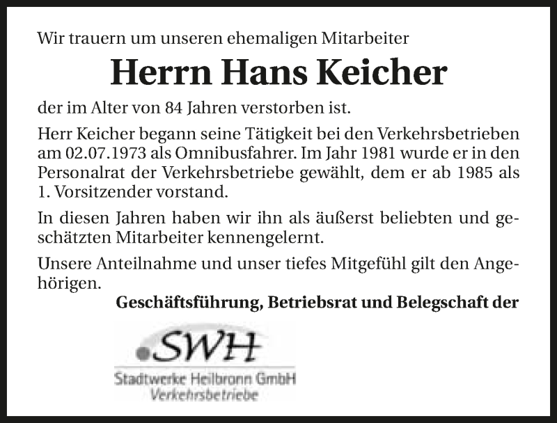 Hier finden Sie alle Traueranzeigen aus der Zeitung, die bisher für Hans Keicher erschienen sind. Weitere Traueranzeigen, die in der Zeitung erscheinen, werden hier ebenfalls aufgelistet