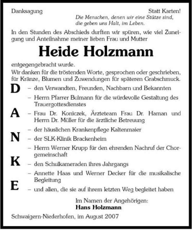 Hier finden Sie alle Traueranzeigen aus der Zeitung, die bisher für Heide Holzmann erschienen sind. Weitere Traueranzeigen, die in der Zeitung erscheinen, werden hier ebenfalls aufgelistet