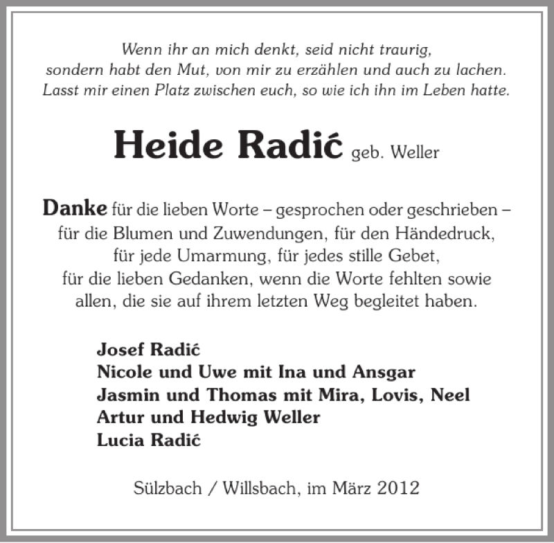 Hier finden Sie alle Traueranzeigen aus der Zeitung, die bisher für Heide Radic erschienen sind. Weitere Traueranzeigen, die in der Zeitung erscheinen, werden hier ebenfalls aufgelistet