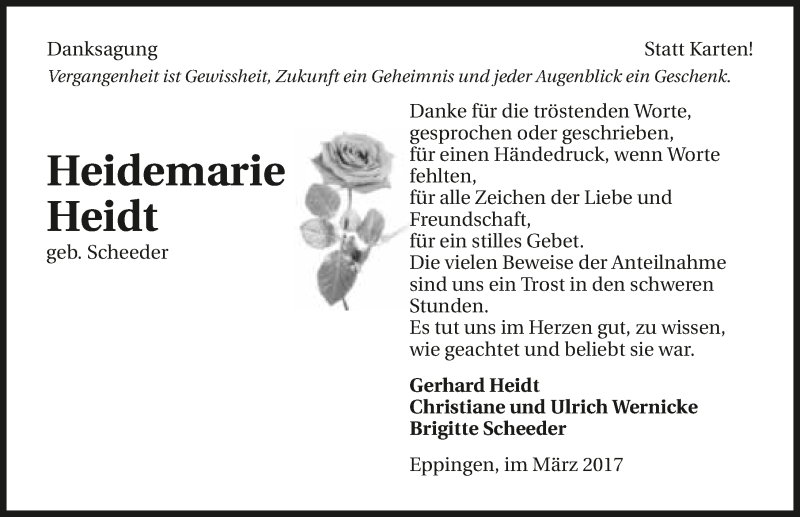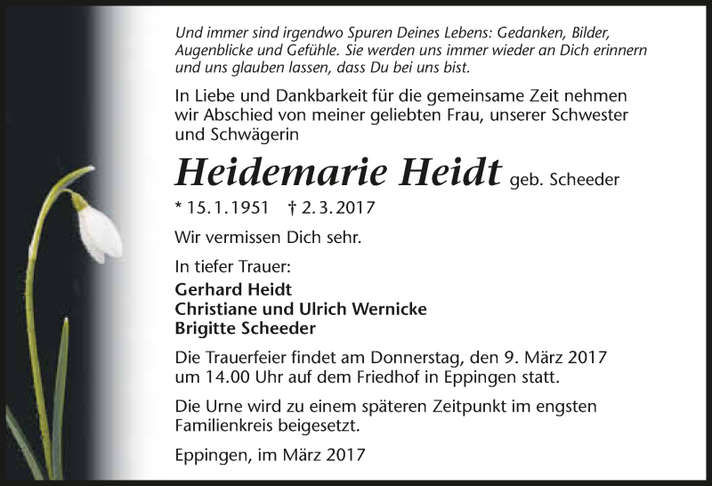 Hier finden Sie alle Traueranzeigen aus der Zeitung, die bisher für Heidemarie Heidt erschienen sind. Weitere Traueranzeigen, die in der Zeitung erscheinen, werden hier ebenfalls aufgelistet