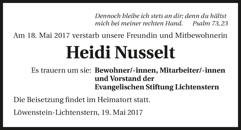 Hier finden Sie alle Traueranzeigen aus der Zeitung, die bisher für Heidi Nusselt erschienen sind. Weitere Traueranzeigen, die in der Zeitung erscheinen, werden hier ebenfalls aufgelistet