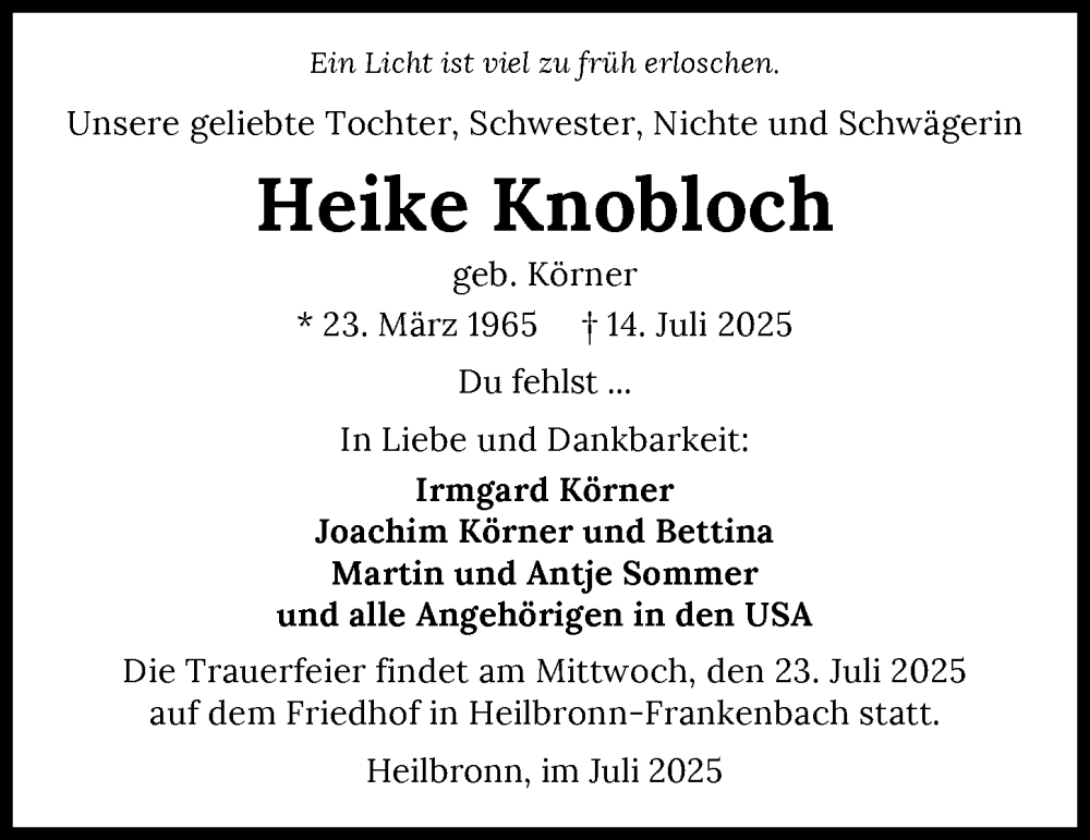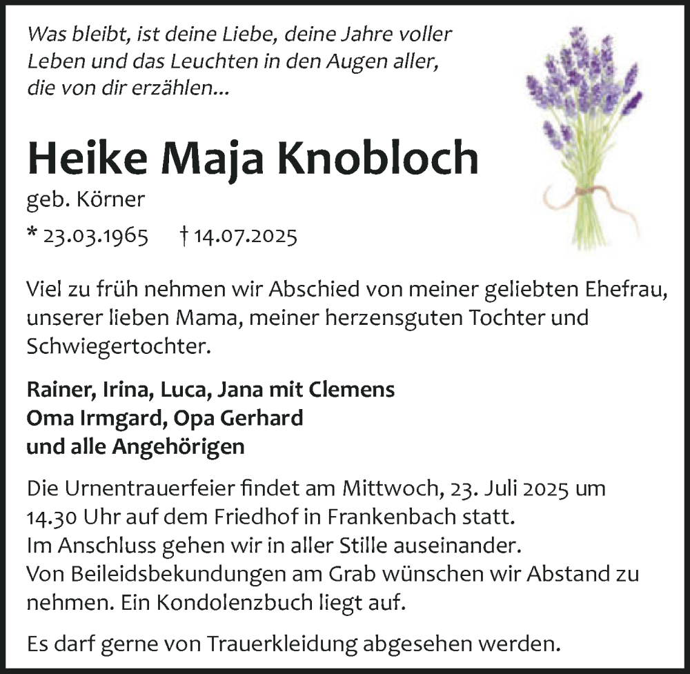 Hier finden Sie alle Traueranzeigen aus der Zeitung, die bisher für Heike Maja Knobloch erschienen sind. Weitere Traueranzeigen, die in der Zeitung erscheinen, werden hier ebenfalls aufgelistet
