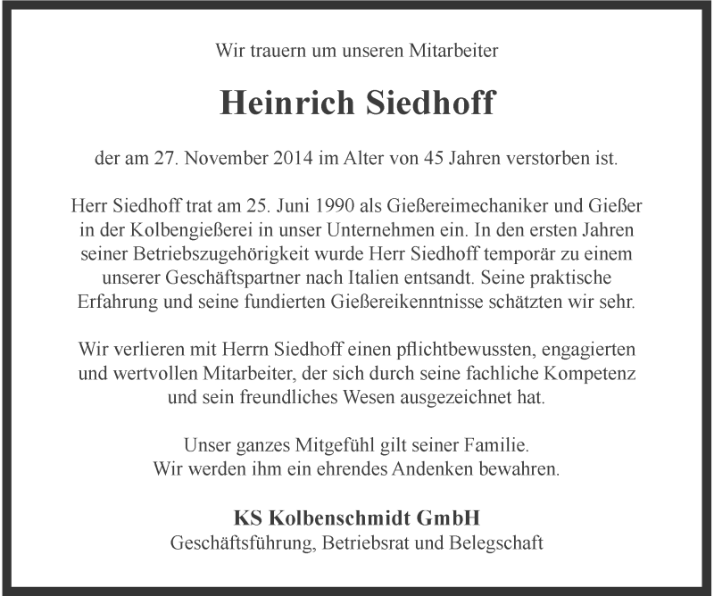 Hier finden Sie alle Traueranzeigen aus der Zeitung, die bisher für Heinrich Siedhoff erschienen sind. Weitere Traueranzeigen, die in der Zeitung erscheinen, werden hier ebenfalls aufgelistet