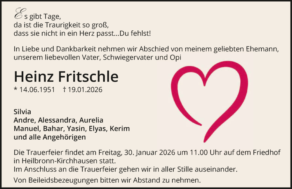 Hier finden Sie alle Traueranzeigen aus der Zeitung, die bisher für Heinz Fritschle erschienen sind. Weitere Traueranzeigen, die in der Zeitung erscheinen, werden hier ebenfalls aufgelistet