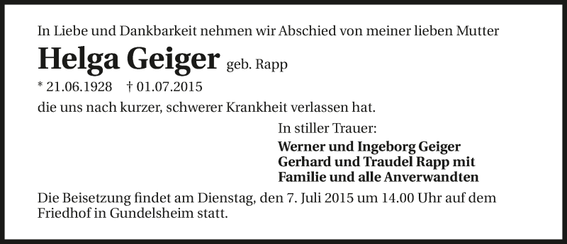Hier finden Sie alle Traueranzeigen aus der Zeitung, die bisher für Helga Geiger erschienen sind. Weitere Traueranzeigen, die in der Zeitung erscheinen, werden hier ebenfalls aufgelistet