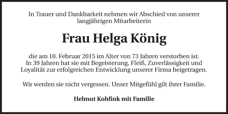 Hier finden Sie alle Traueranzeigen aus der Zeitung, die bisher für Helga König erschienen sind. Weitere Traueranzeigen, die in der Zeitung erscheinen, werden hier ebenfalls aufgelistet