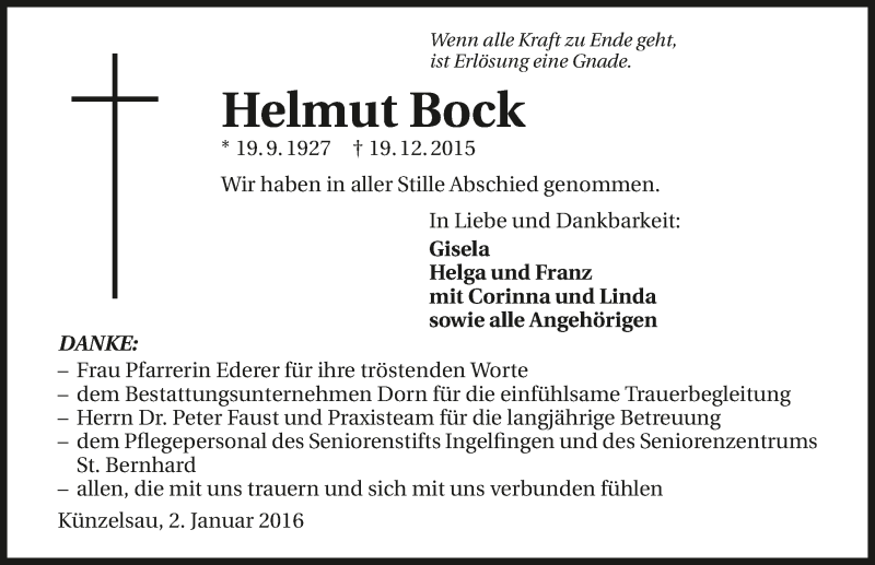 Hier finden Sie alle Traueranzeigen aus der Zeitung, die bisher für Helmut Bock erschienen sind. Weitere Traueranzeigen, die in der Zeitung erscheinen, werden hier ebenfalls aufgelistet