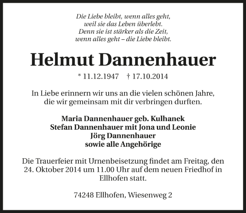 Hier finden Sie alle Traueranzeigen aus der Zeitung, die bisher für Helmut Dannenhauer erschienen sind. Weitere Traueranzeigen, die in der Zeitung erscheinen, werden hier ebenfalls aufgelistet