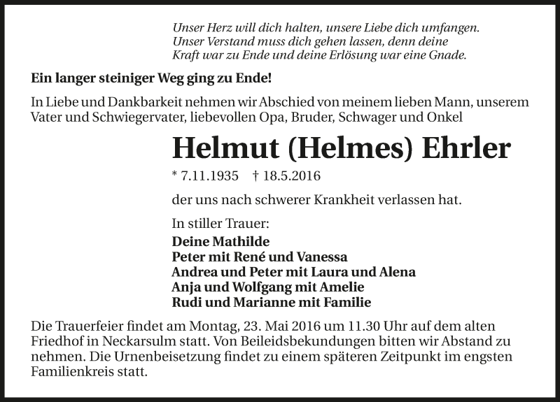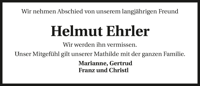 Hier finden Sie alle Traueranzeigen aus der Zeitung, die bisher für Helmut Ehrler erschienen sind. Weitere Traueranzeigen, die in der Zeitung erscheinen, werden hier ebenfalls aufgelistet