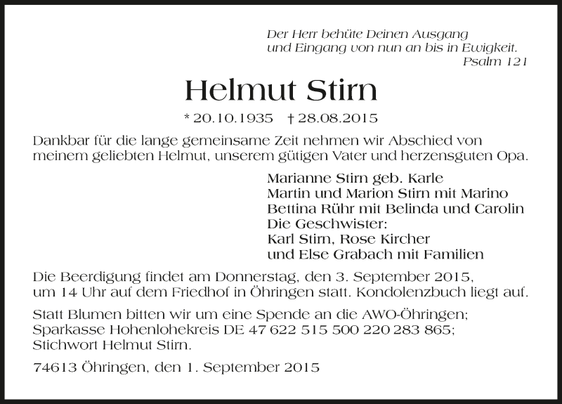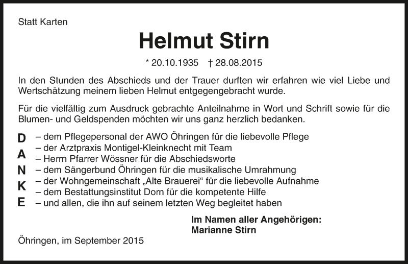 Hier finden Sie alle Traueranzeigen aus der Zeitung, die bisher für Helmut Stirn erschienen sind. Weitere Traueranzeigen, die in der Zeitung erscheinen, werden hier ebenfalls aufgelistet