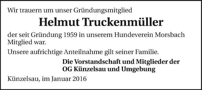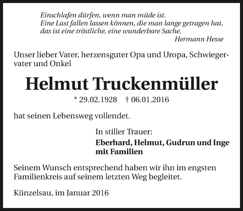 Hier finden Sie alle Traueranzeigen aus der Zeitung, die bisher für Helmut Truckenmüller erschienen sind. Weitere Traueranzeigen, die in der Zeitung erscheinen, werden hier ebenfalls aufgelistet