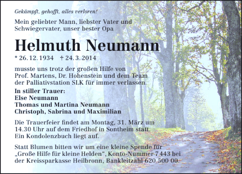 Hier finden Sie alle Traueranzeigen aus der Zeitung, die bisher für Helmuth Neumann erschienen sind. Weitere Traueranzeigen, die in der Zeitung erscheinen, werden hier ebenfalls aufgelistet