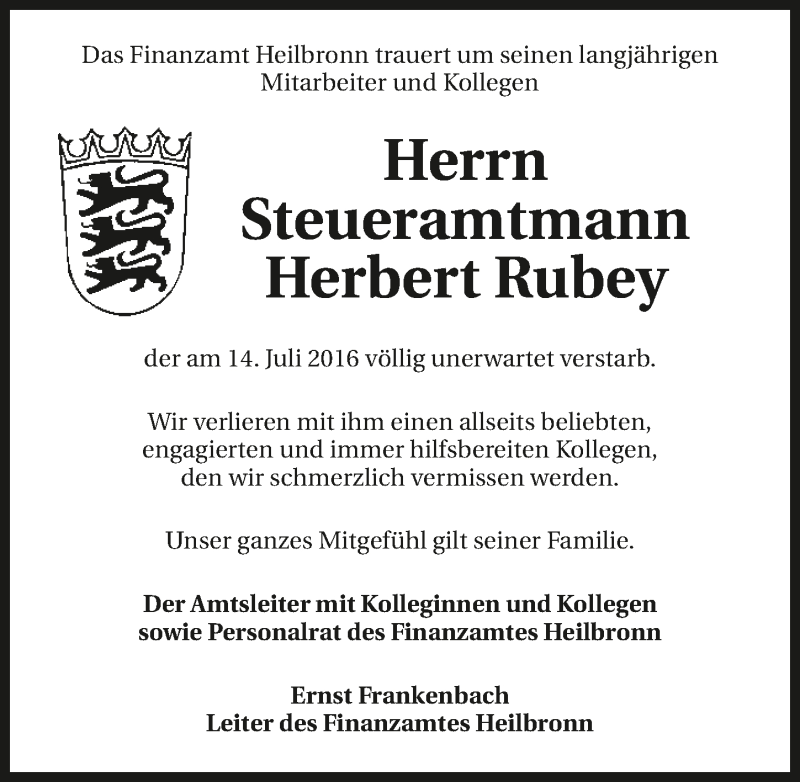 Hier finden Sie alle Traueranzeigen aus der Zeitung, die bisher für Herbert Rubey erschienen sind. Weitere Traueranzeigen, die in der Zeitung erscheinen, werden hier ebenfalls aufgelistet