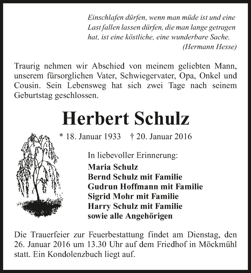 Hier finden Sie alle Traueranzeigen aus der Zeitung, die bisher für Herbert Schulz erschienen sind. Weitere Traueranzeigen, die in der Zeitung erscheinen, werden hier ebenfalls aufgelistet