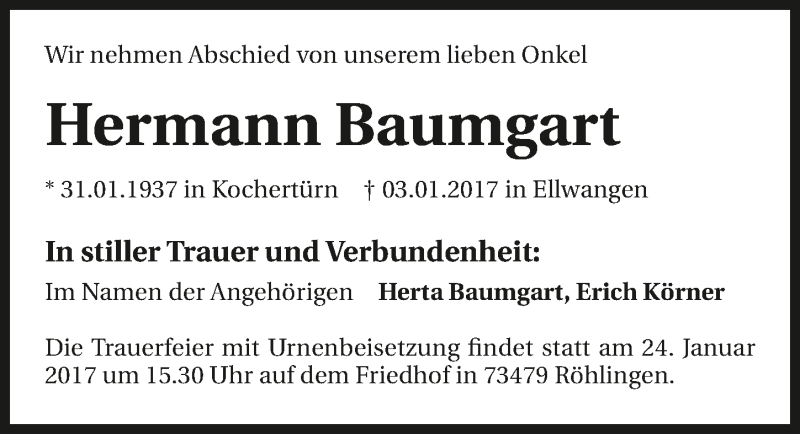 Hier finden Sie alle Traueranzeigen aus der Zeitung, die bisher für Hermann Baumgart erschienen sind. Weitere Traueranzeigen, die in der Zeitung erscheinen, werden hier ebenfalls aufgelistet