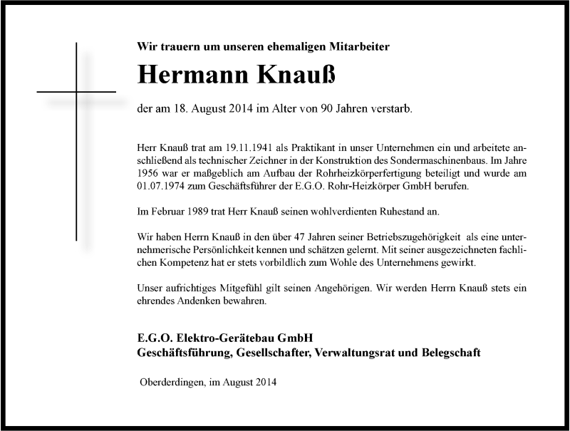 Hier finden Sie alle Traueranzeigen aus der Zeitung, die bisher für Hermann Knauß erschienen sind. Weitere Traueranzeigen, die in der Zeitung erscheinen, werden hier ebenfalls aufgelistet