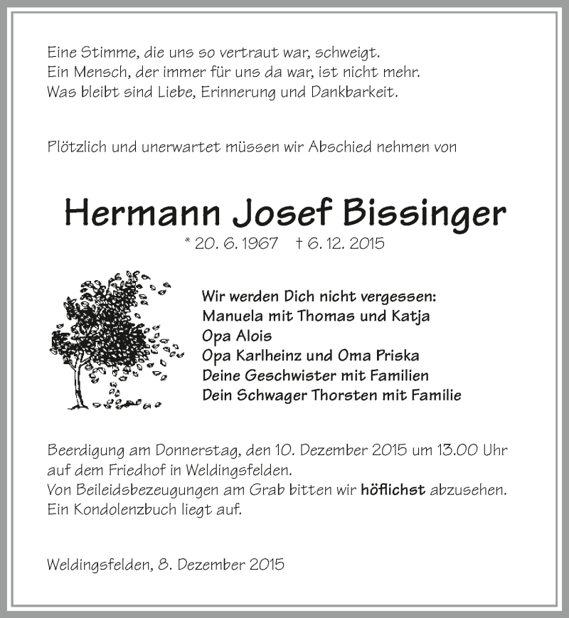 Hier finden Sie alle Traueranzeigen aus der Zeitung, die bisher für Hermann Josef Bissinger erschienen sind. Weitere Traueranzeigen, die in der Zeitung erscheinen, werden hier ebenfalls aufgelistet
