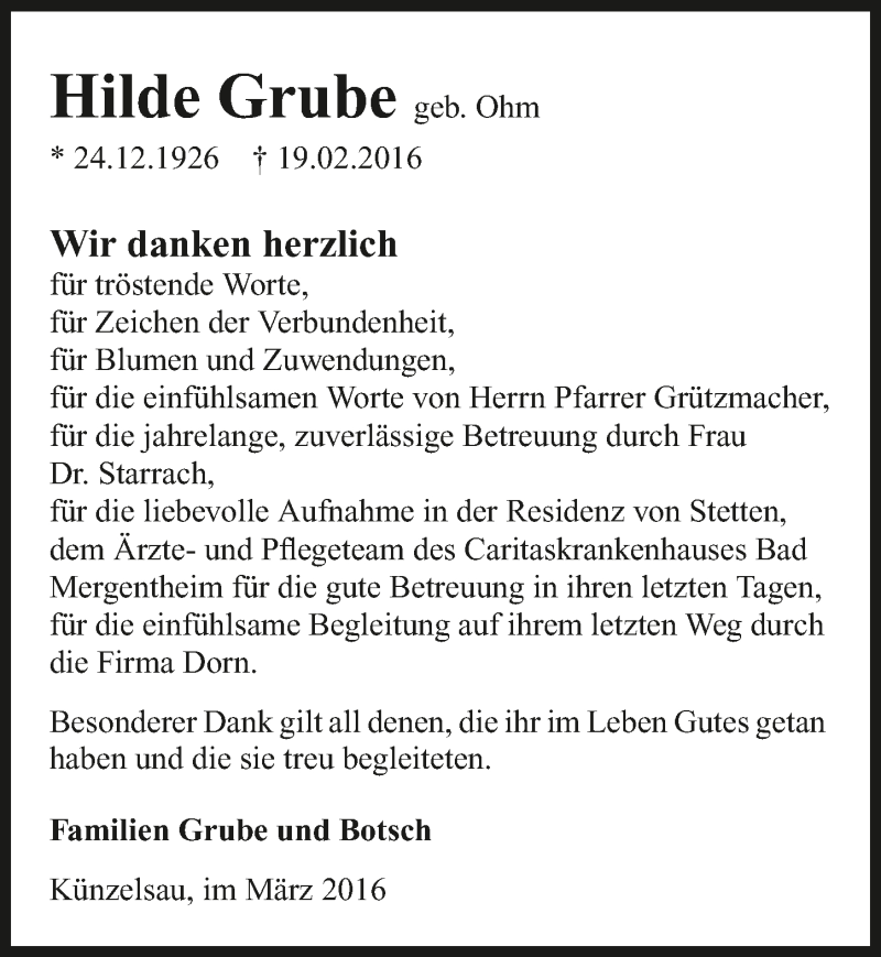 Hier finden Sie alle Traueranzeigen aus der Zeitung, die bisher für Hilde Grube erschienen sind. Weitere Traueranzeigen, die in der Zeitung erscheinen, werden hier ebenfalls aufgelistet