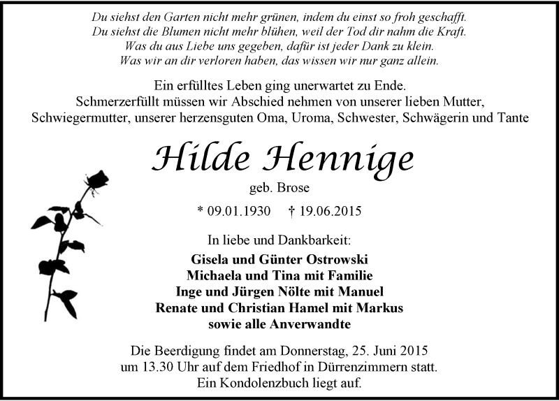 Hier finden Sie alle Traueranzeigen aus der Zeitung, die bisher für Hilde Hennige erschienen sind. Weitere Traueranzeigen, die in der Zeitung erscheinen, werden hier ebenfalls aufgelistet