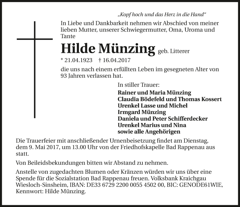 Hier finden Sie alle Traueranzeigen aus der Zeitung, die bisher für Hilde Münzing erschienen sind. Weitere Traueranzeigen, die in der Zeitung erscheinen, werden hier ebenfalls aufgelistet