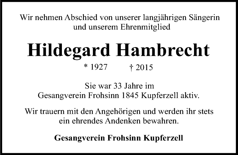 Hier finden Sie alle Traueranzeigen aus der Zeitung, die bisher für Hildegard Hambrecht erschienen sind. Weitere Traueranzeigen, die in der Zeitung erscheinen, werden hier ebenfalls aufgelistet