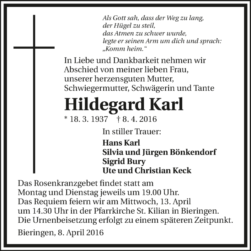 Hier finden Sie alle Traueranzeigen aus der Zeitung, die bisher für Hildegard Karl erschienen sind. Weitere Traueranzeigen, die in der Zeitung erscheinen, werden hier ebenfalls aufgelistet
