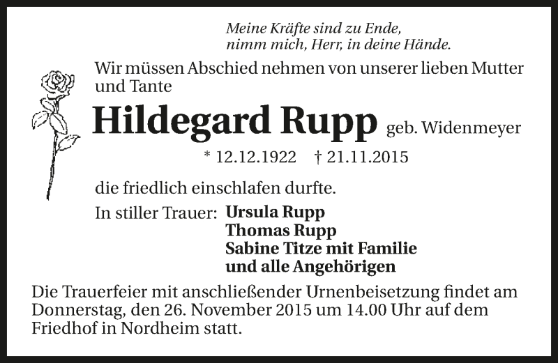 Hier finden Sie alle Traueranzeigen aus der Zeitung, die bisher für Hildegard Rupp erschienen sind. Weitere Traueranzeigen, die in der Zeitung erscheinen, werden hier ebenfalls aufgelistet