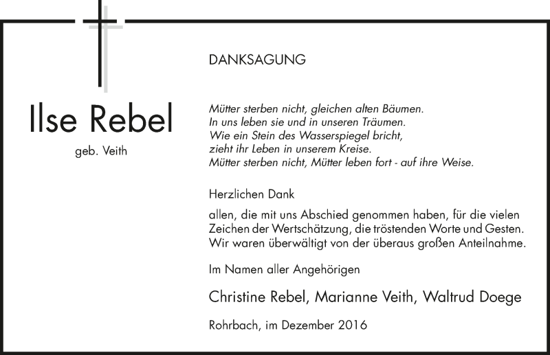 Hier finden Sie alle Traueranzeigen aus der Zeitung, die bisher für Ilse Rebel erschienen sind. Weitere Traueranzeigen, die in der Zeitung erscheinen, werden hier ebenfalls aufgelistet