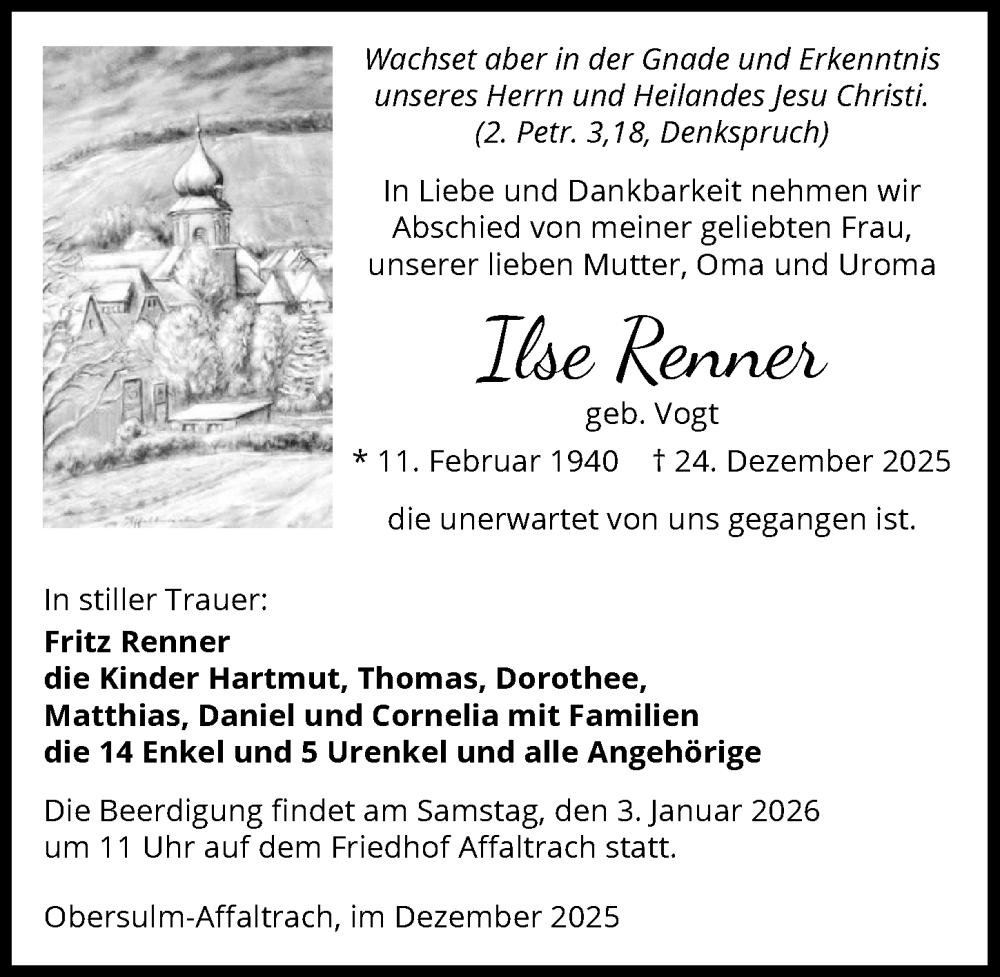 Hier finden Sie alle Traueranzeigen aus der Zeitung, die bisher für Ilse Renner erschienen sind. Weitere Traueranzeigen, die in der Zeitung erscheinen, werden hier ebenfalls aufgelistet