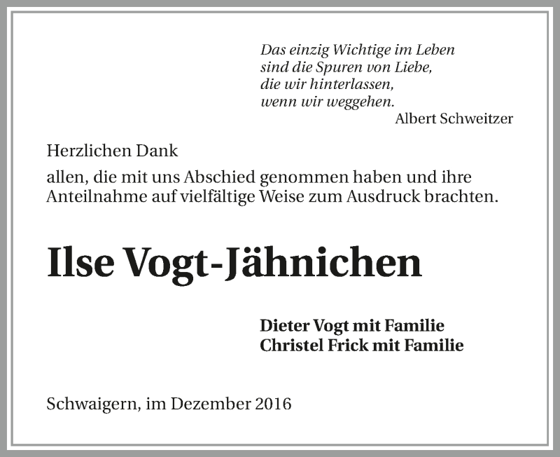 Hier finden Sie alle Traueranzeigen aus der Zeitung, die bisher für Ilse Vogt-Jähnichen erschienen sind. Weitere Traueranzeigen, die in der Zeitung erscheinen, werden hier ebenfalls aufgelistet