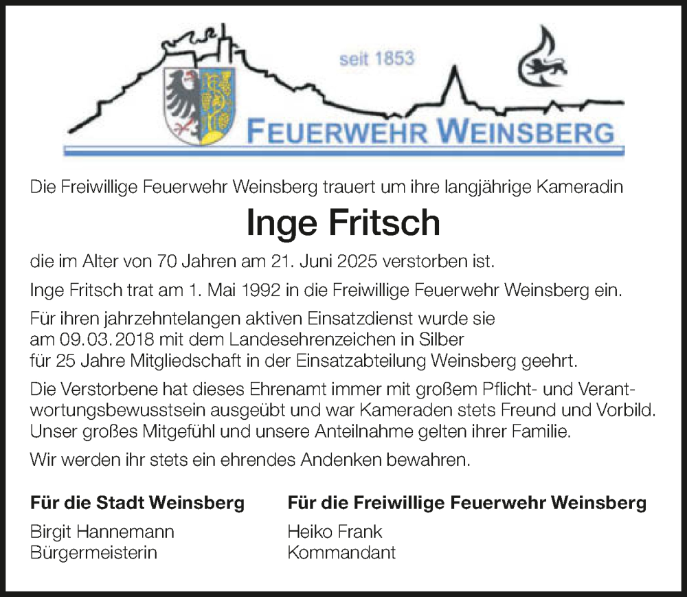 Hier finden Sie alle Traueranzeigen aus der Zeitung, die bisher für Inge Fritsch erschienen sind. Weitere Traueranzeigen, die in der Zeitung erscheinen, werden hier ebenfalls aufgelistet