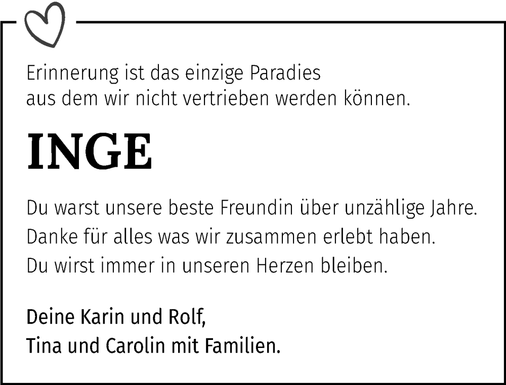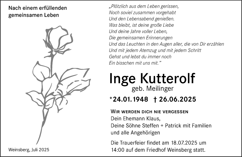 Hier finden Sie alle Traueranzeigen aus der Zeitung, die bisher für Inge Kutterolf erschienen sind. Weitere Traueranzeigen, die in der Zeitung erscheinen, werden hier ebenfalls aufgelistet